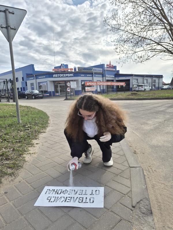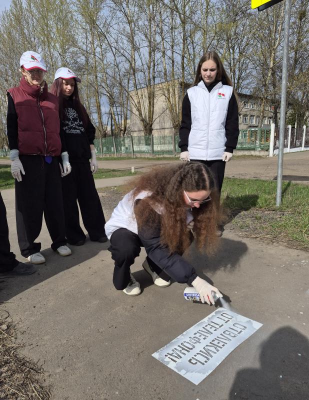 Ребята вышли на улицу Комарова, чтобы нанести предупреждающие надписи перед пешеходными переходами вблизи учебного заведения. При помощи трафаретов и баллончиков с белой краской девятиклассники создали яркие напоминания для взрослых и детей.
