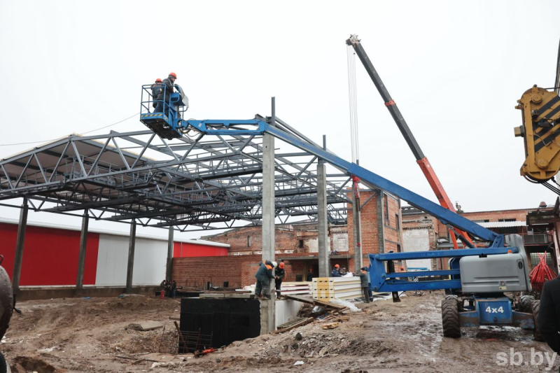Над возведением новых объектов ежедневно трудятся от 40 до 60 человек, им в помощь около 10–12 единиц техники: экскаваторы, самосвалы, подъемники. Строители вышли на черновую заливку полов, смонтировали фасад здания, накрывают кровлю. Обшивку в цехе полуфабрикатов формируют из сэндвич-панелей, в аммиачно-компрессорном — из легкосбрасываемых конструкций в соответствии с требованиями охраны труда. Параллельно идет установка оборудования.