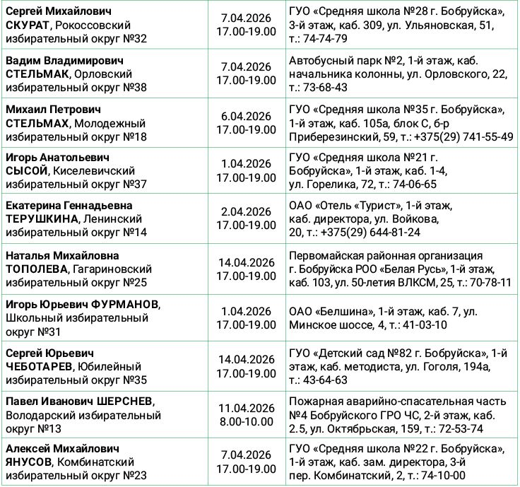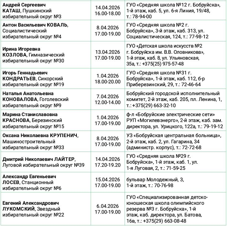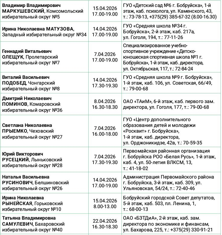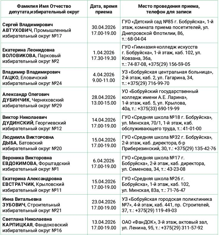 График проведения личных приемов граждан и юридических лиц депутатами Бобруйского городского Совета депутатов 29-го созыва на апрель 2026 года