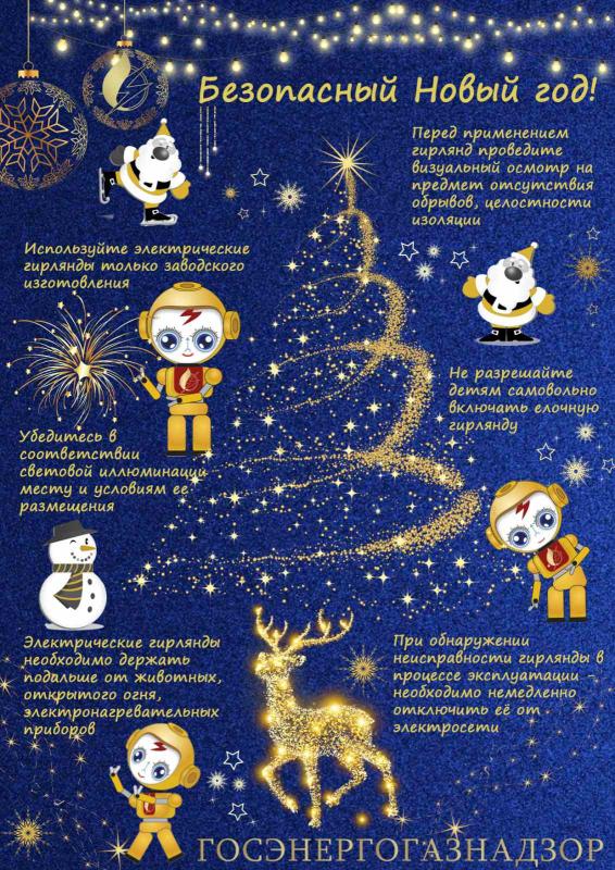 Во время подготовки и проведения новогодних мероприятий необходимо обеспечить постоянное наблюдение за состоянием электрических сетей, гирлянд, рекламного освещения в целях предотвращения возникновения реальной угрозы поражения электрическим током, возникновения пожаров.